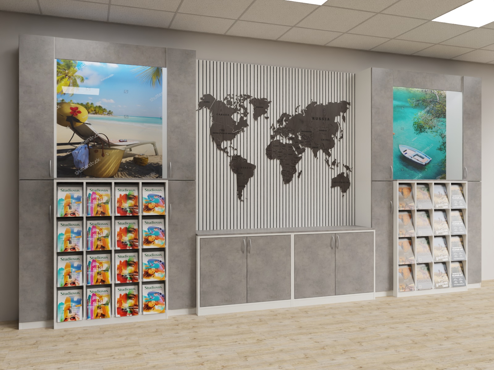 Kombination mit 3d Weltkarte aus Holz auf AkustikpaneeleKorpus: W980 Weiß Front: F186 Beton -