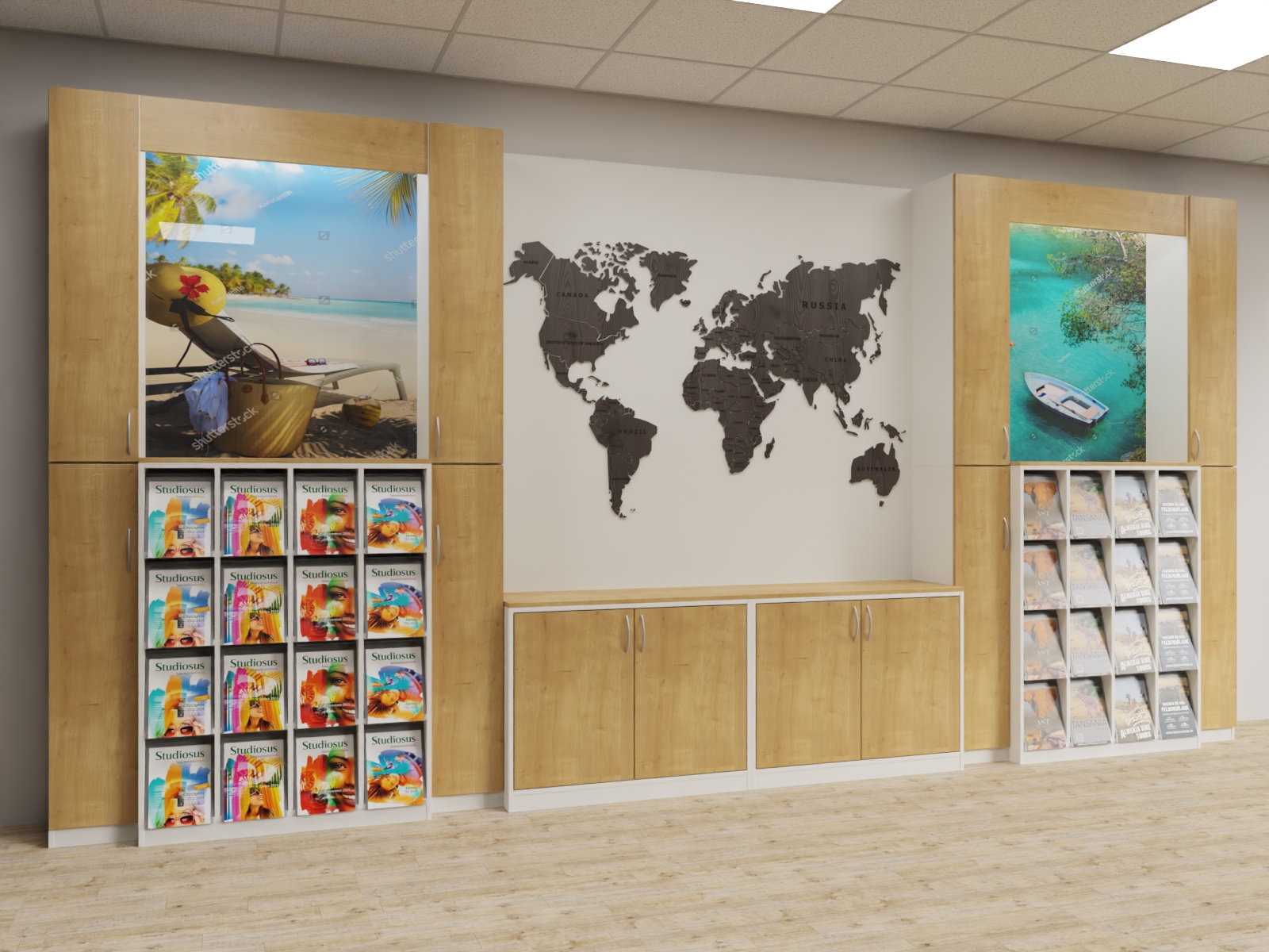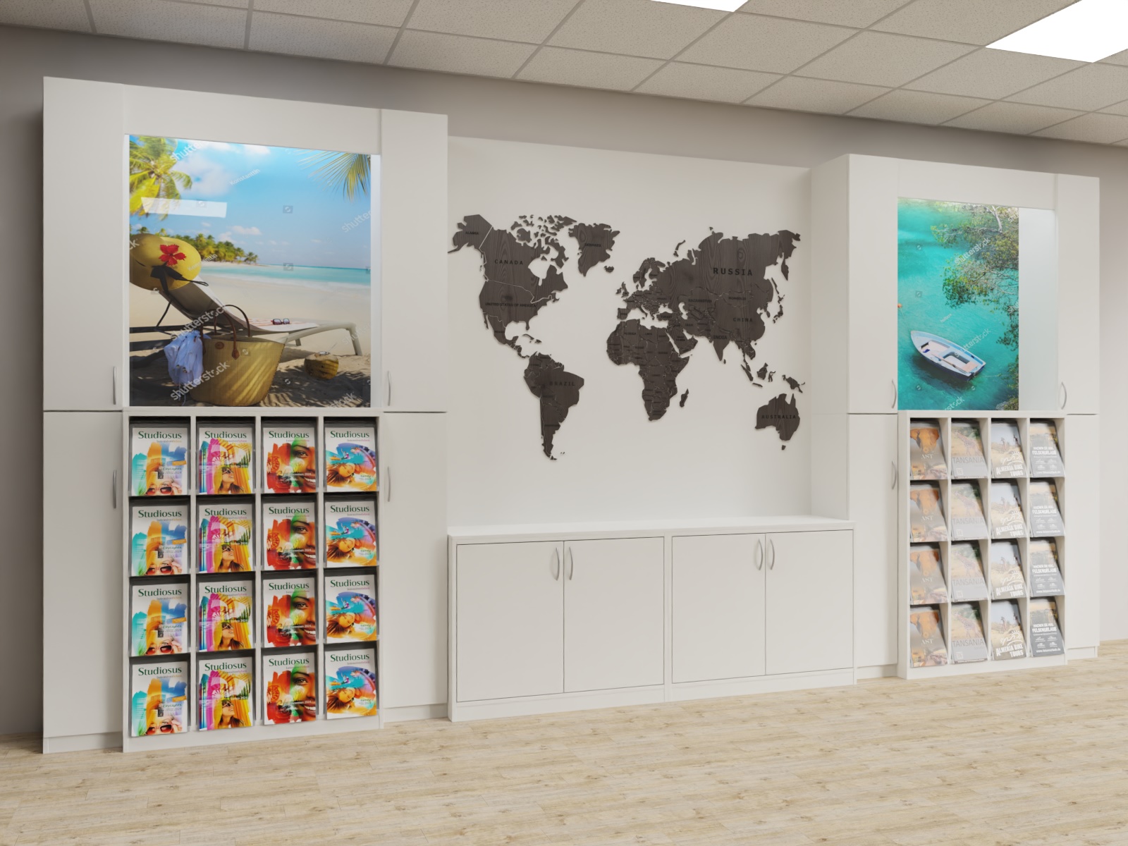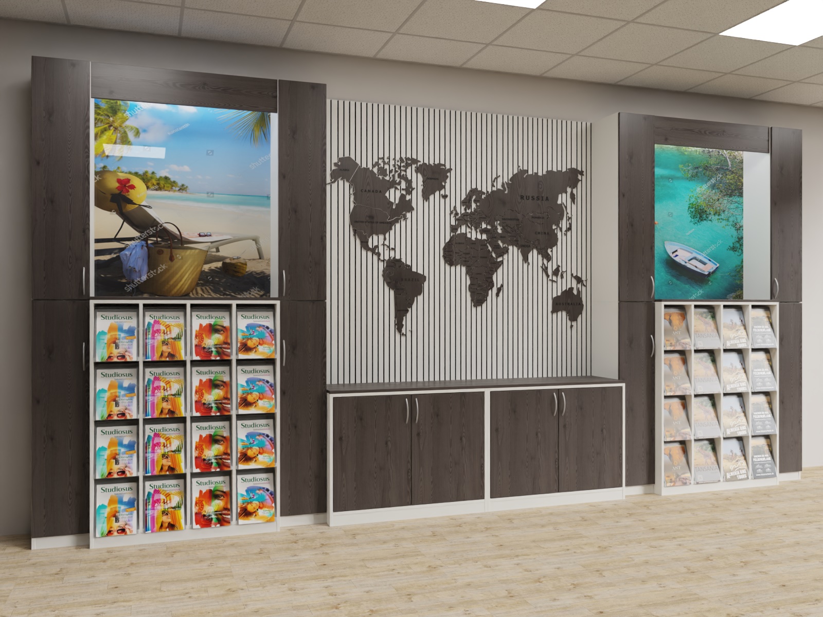 Kombination mit 3d Weltkarte aus Holz auf AkustikpaneeleKorpus: W980 Weiß Front: W980 Weiß