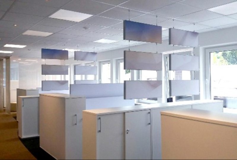 Nutzen Sie den schallabsorbierenden Schreibtischtopper nicht nur als Trennelement. Das Spanntuch können Sie individuell gestalten und somit zusätzlich auch visuell das Gefühl von Ruhe geben. Das schafft eine ideale Arbeitsatmosphäre selbst in großen Büroräumen.