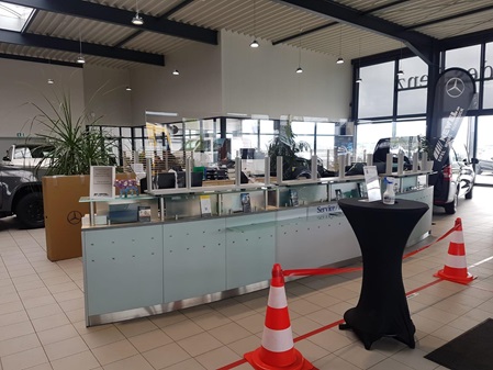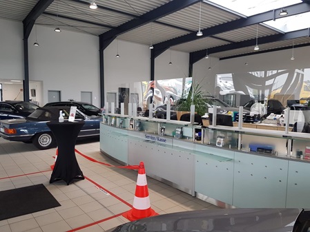 Virenschutz für Theken. Zum Beispiel im Autohaus. Hier können die Mitarbeiter des Autohauses sich wieder geschützt um das kümmern, was ihnen am wichtigsten ist. Ihre Kunden.