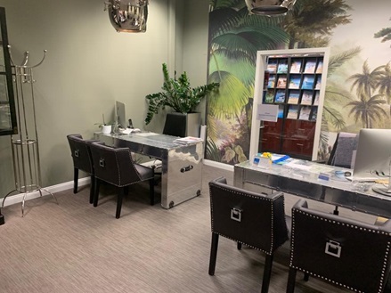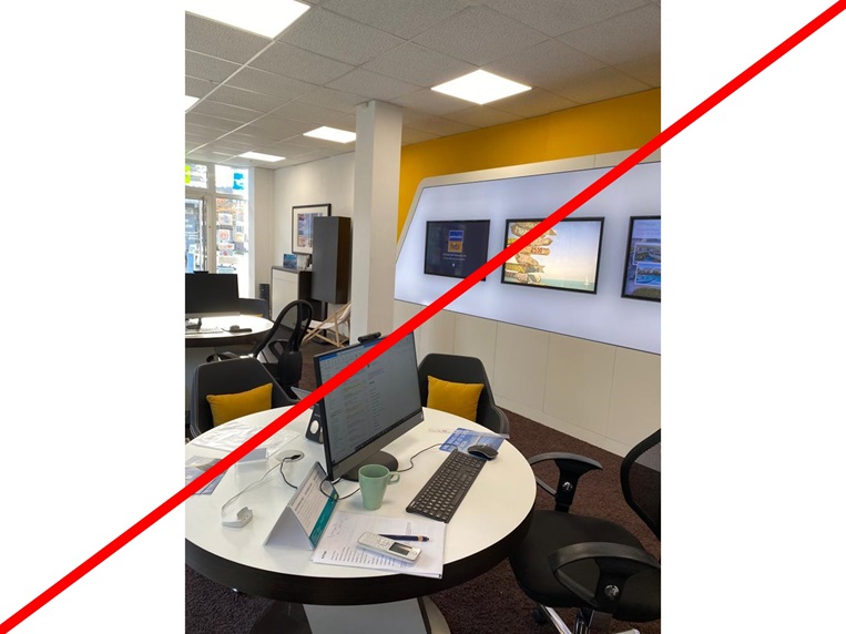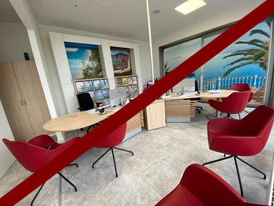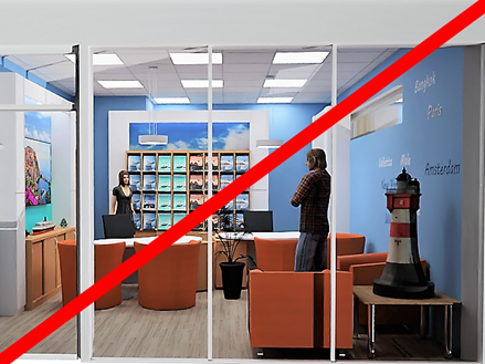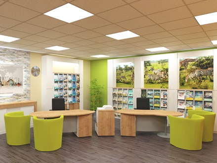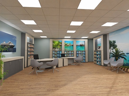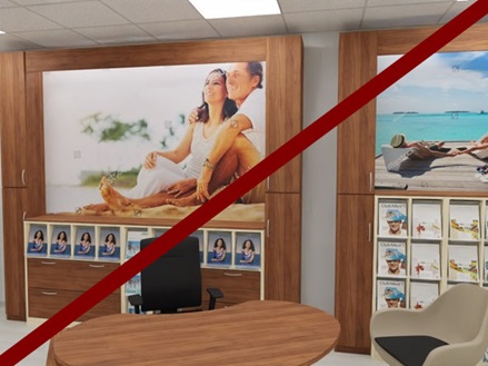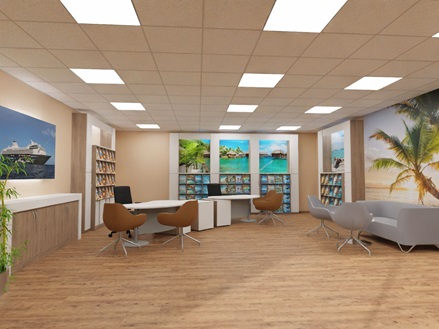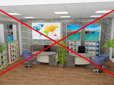 Zeitlos schöne Reisebüro Einrichtung mit drei Arbeitsplätzen.