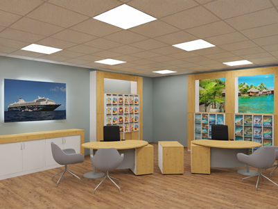 Prospektschränke mit Sommer- Wintereinteilung. Sideboards, 2x Reisebürocounter wie abgebildet oder ähnlich. Bestuhlung aus Secondhand Bestand oder neu. Verhandlungssache.