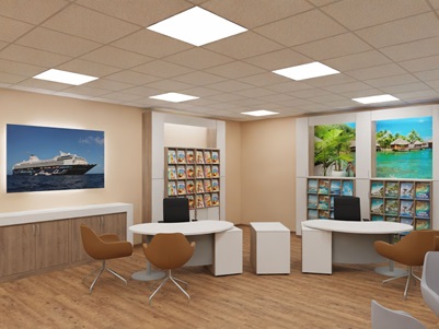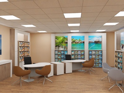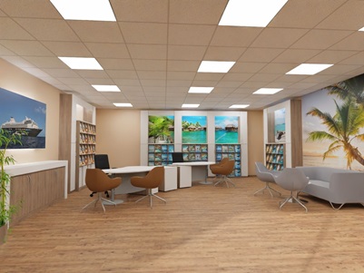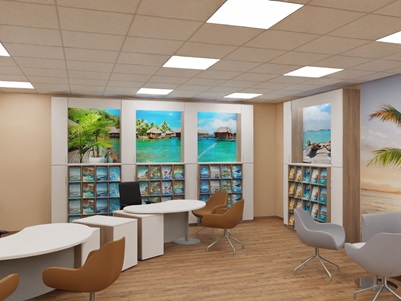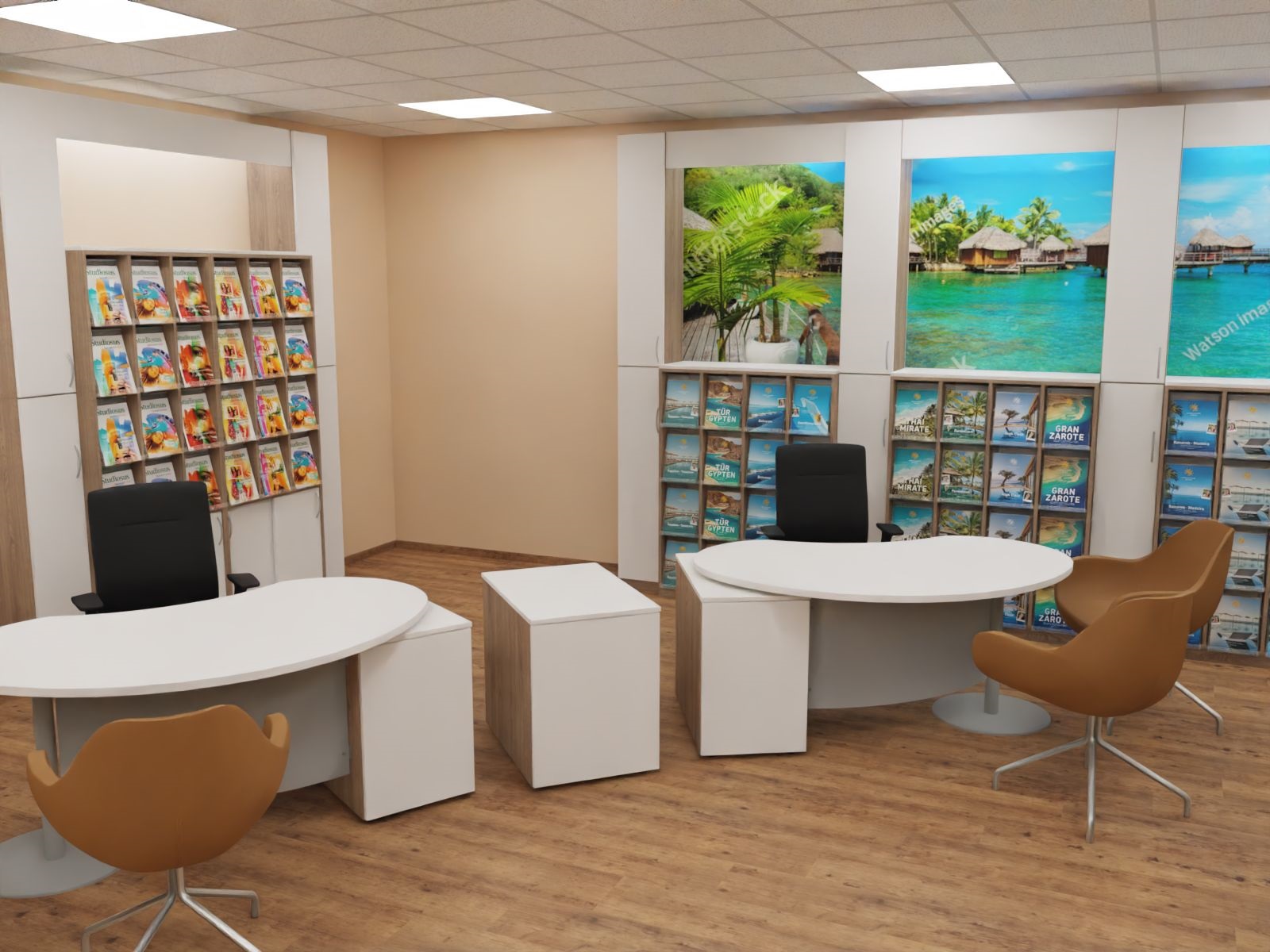 Prospektschränke mit Sommer- Wintereinteilung. Sideboards, 2x Reisebürocounter wie abgebildet oder ähnlich. Bestuhlung aus Secondhand Bestand oder neu. Verhandlungssache.