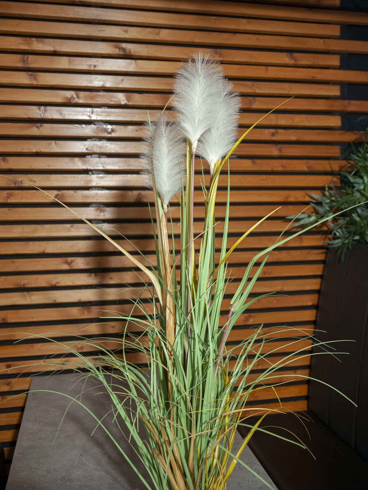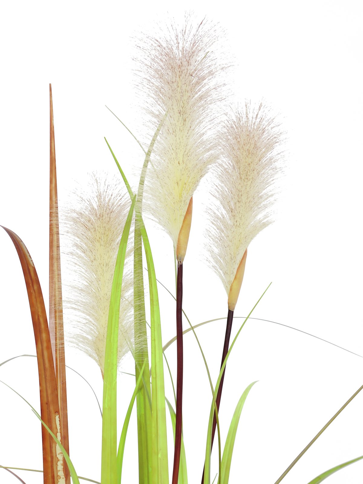 Die künstliche Schilfgrasstaude besteht aus 3 Halmen mit fedrigem Blütenstand. Diese sind von üppigen Grasblättern in den unterschiedlichsten Grün- und Brauntönen umgeben, die beim Aufstellen bereits von selbst in Form fallen. Ein umständliches Zupfen ist somit nicht notwendig.