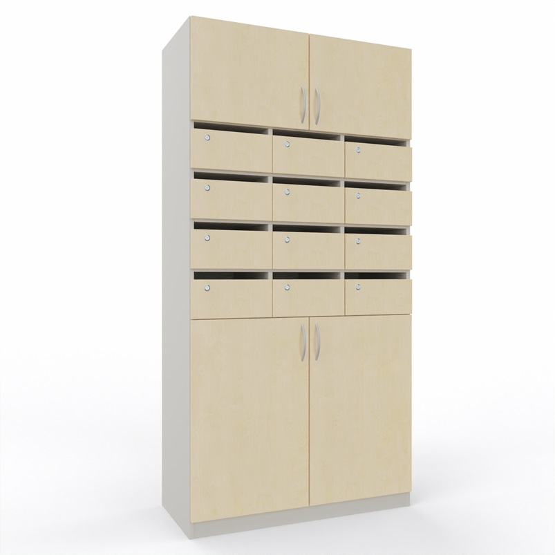 Postfachschrank mit 12 Postfächern und Türen oben und unten.