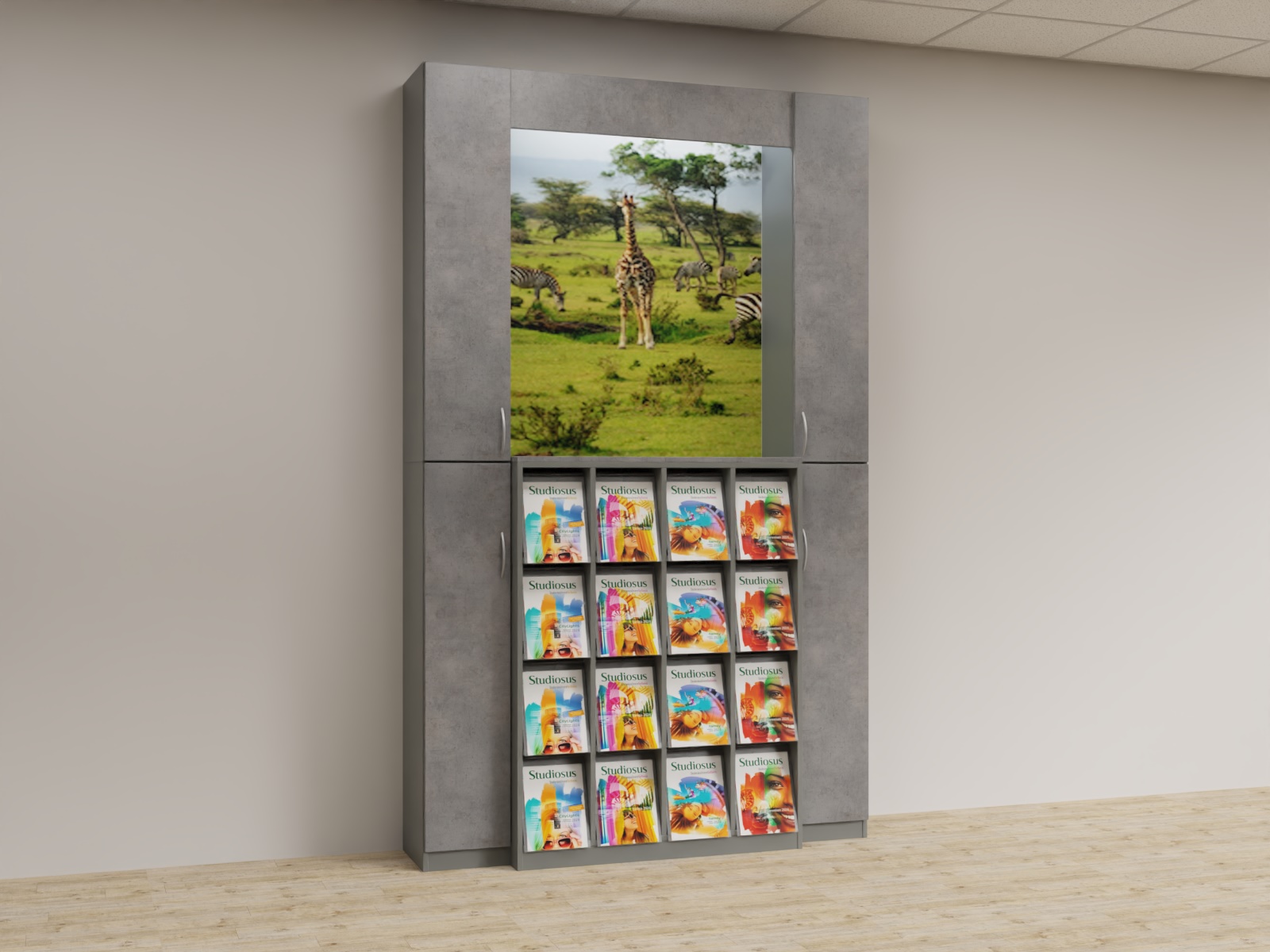 Variante 03 2x Funktionsäule,1x K4x4 Prospektschrank, Bildrückwände, Lichtwinkel